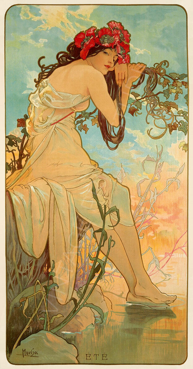 The movement I feel most connected to is Art Nouveau. It was a break from the imitative historicism that dominated the 19th century, creating something new and unique. Art Nouveau sought to unify fine art and applied arts, bringing beauty into everyday objects and spaces. What draws me to it is how effortlessly it blends beauty, nature, and fantasy. The flowing lines—whether in the curves of hair, fabric, or the vines and floral motifs wrapping around figures—give the artwork an almost living quality, as though it’s telling a story.